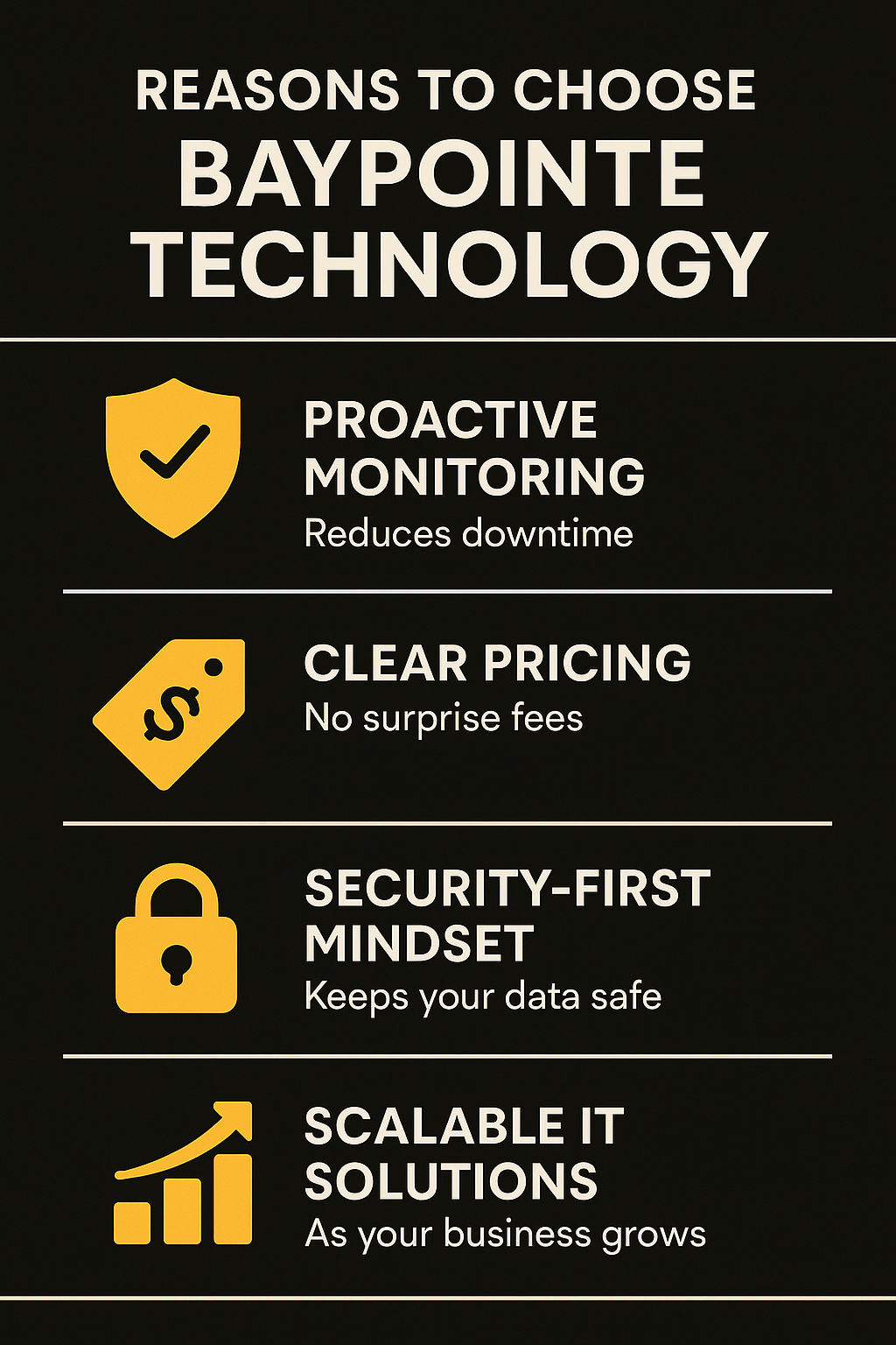 Not all IT support companies are the same. Baypointe Technology stands apart by combining hands-on local service with proven best practices used by larger enterprises.